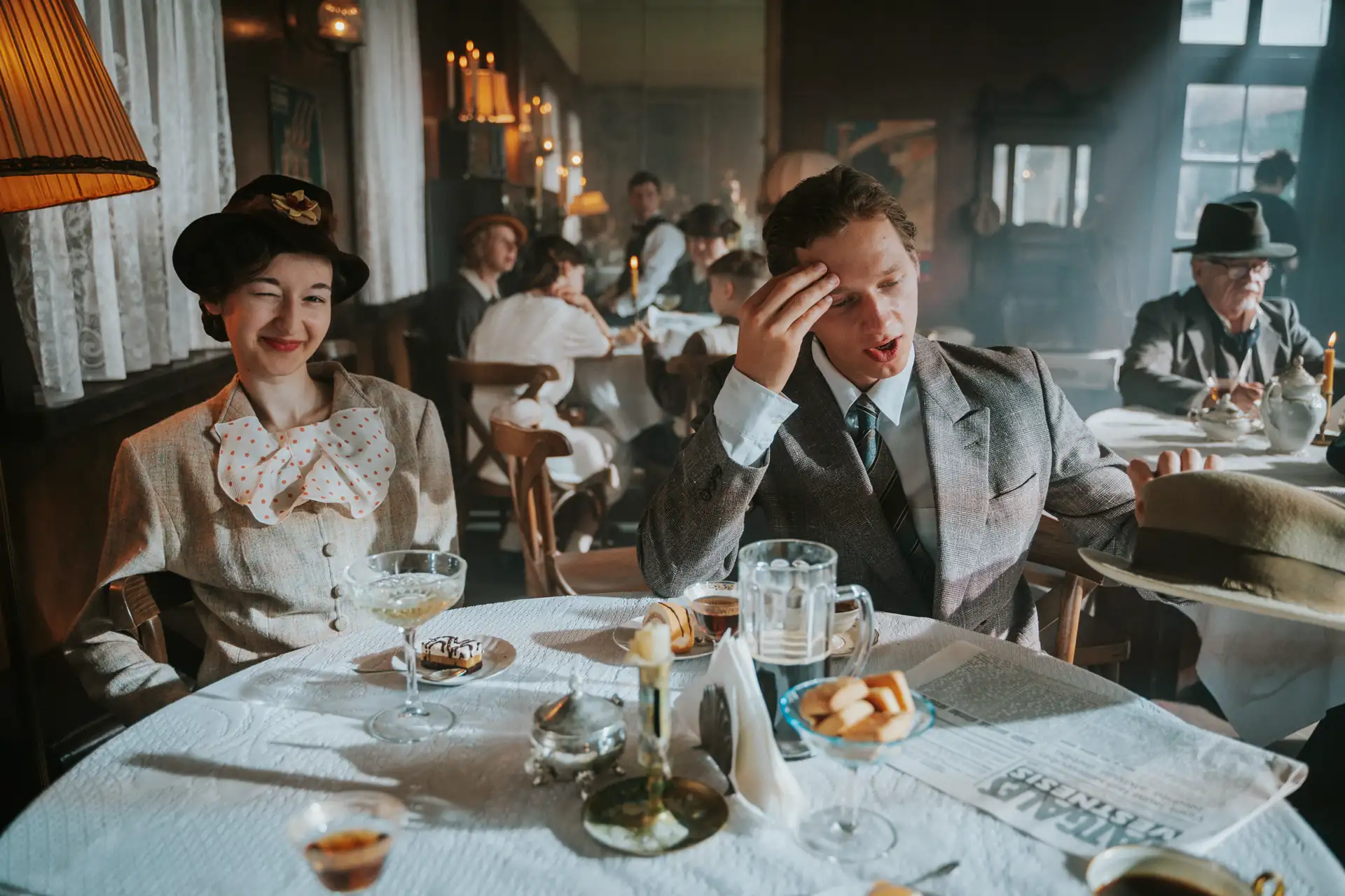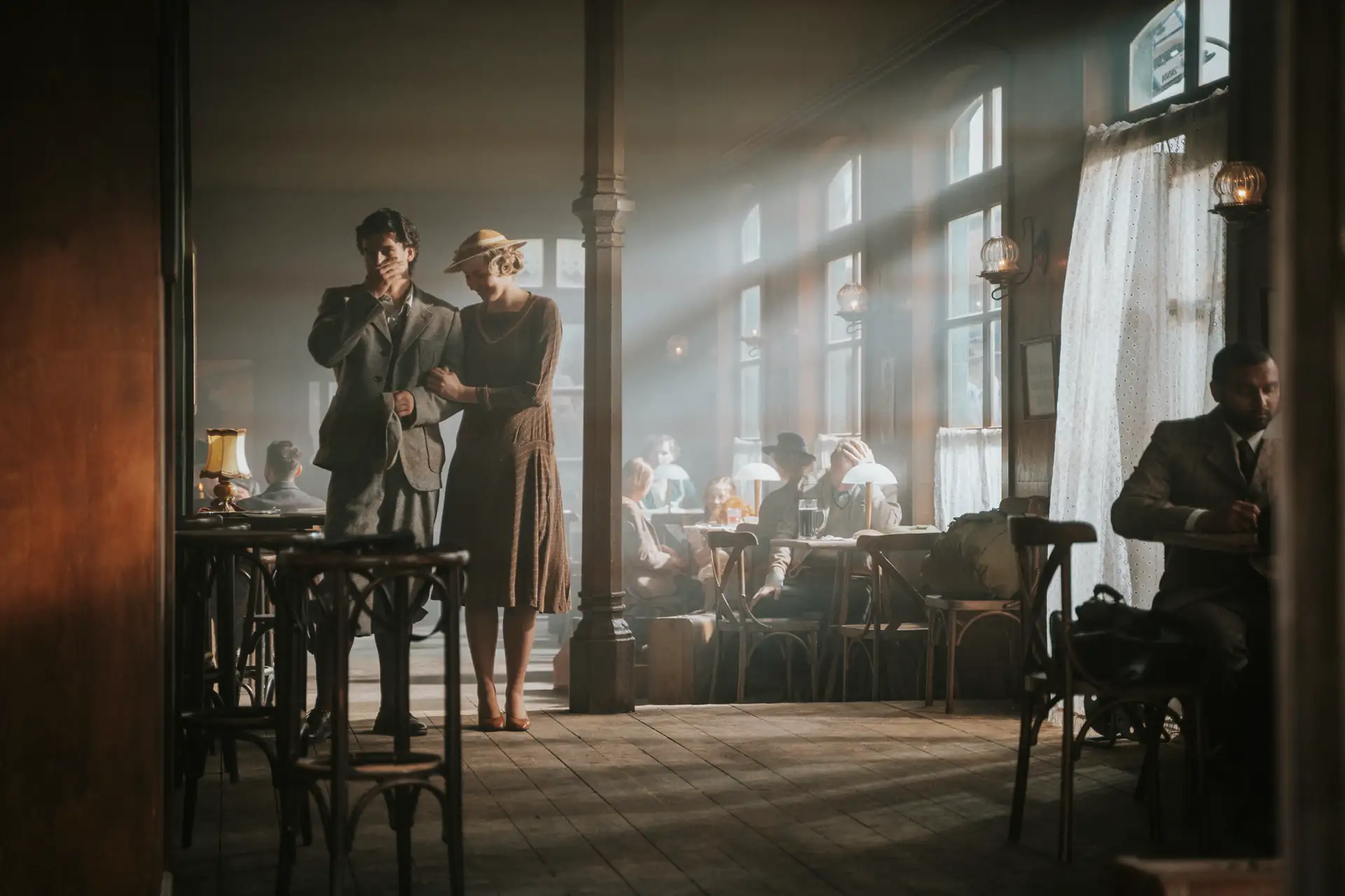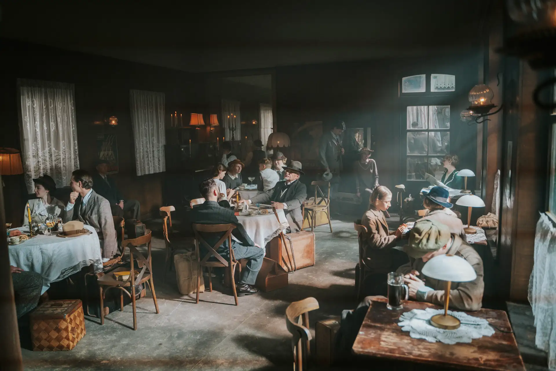 A nostalgic, early 20th-century train station restaurant set featuring tall arched windows and dark wood paneling, complete with period-accurate bistro tables, vintage luggage, and a prominent classic station clock, is ideal for creating immersive and evocative period scenes.