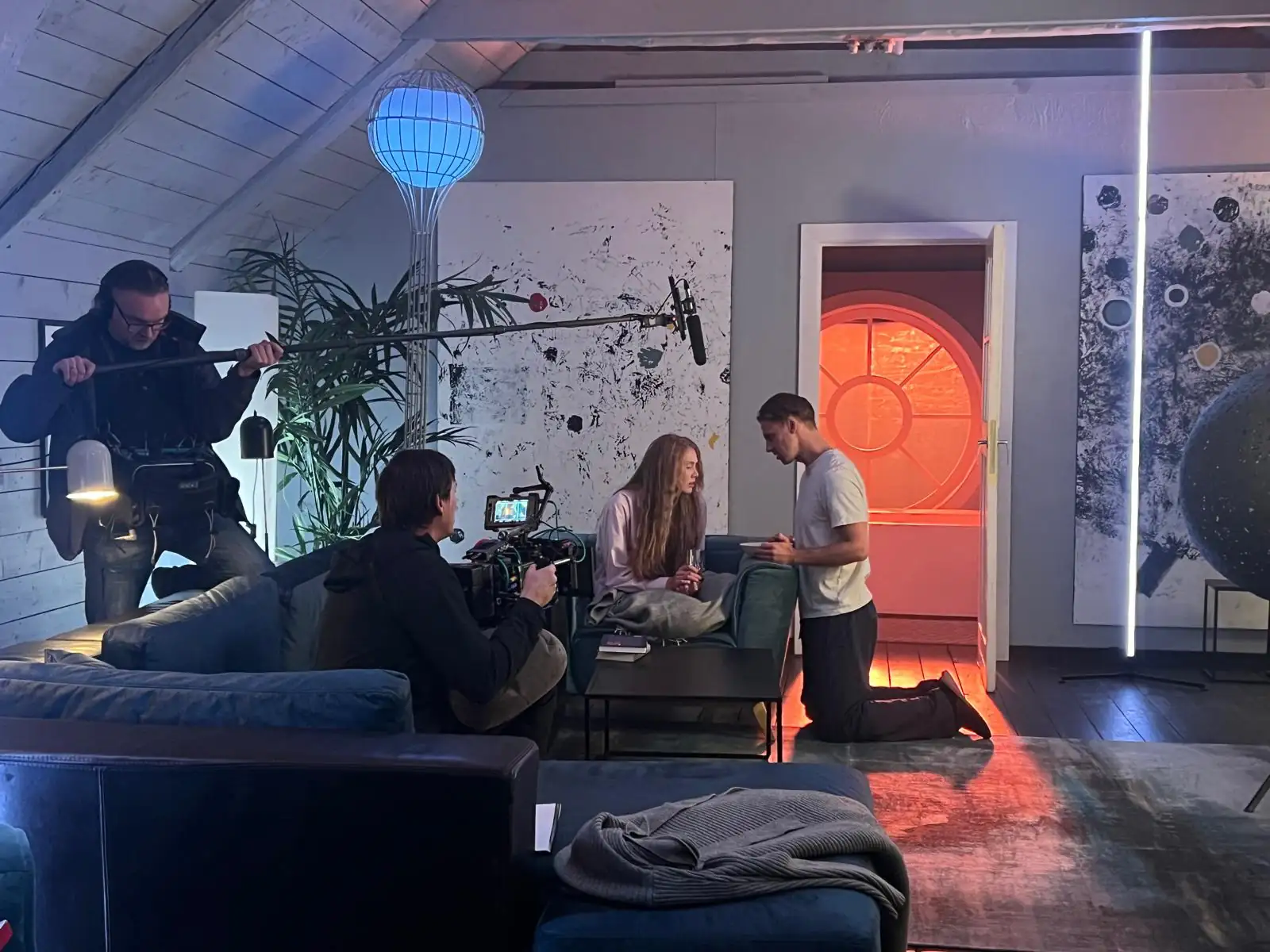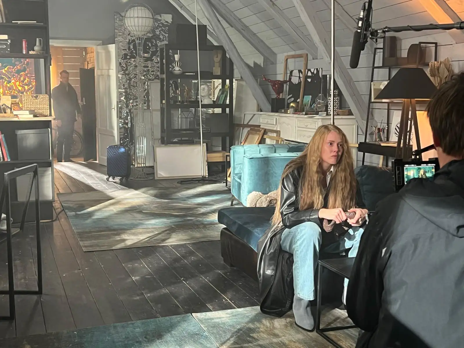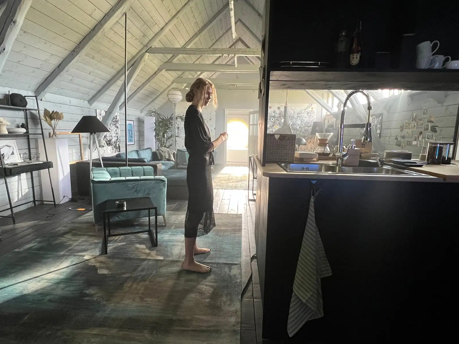 A moody, open-concept bohemian attic loft set bathed in cinematic light, complete with slanted exposed-beam ceilings, striking abstract art, and plush velvet furnishings, is ideal for creating atmospheric and emotionally driven contemporary scenes.